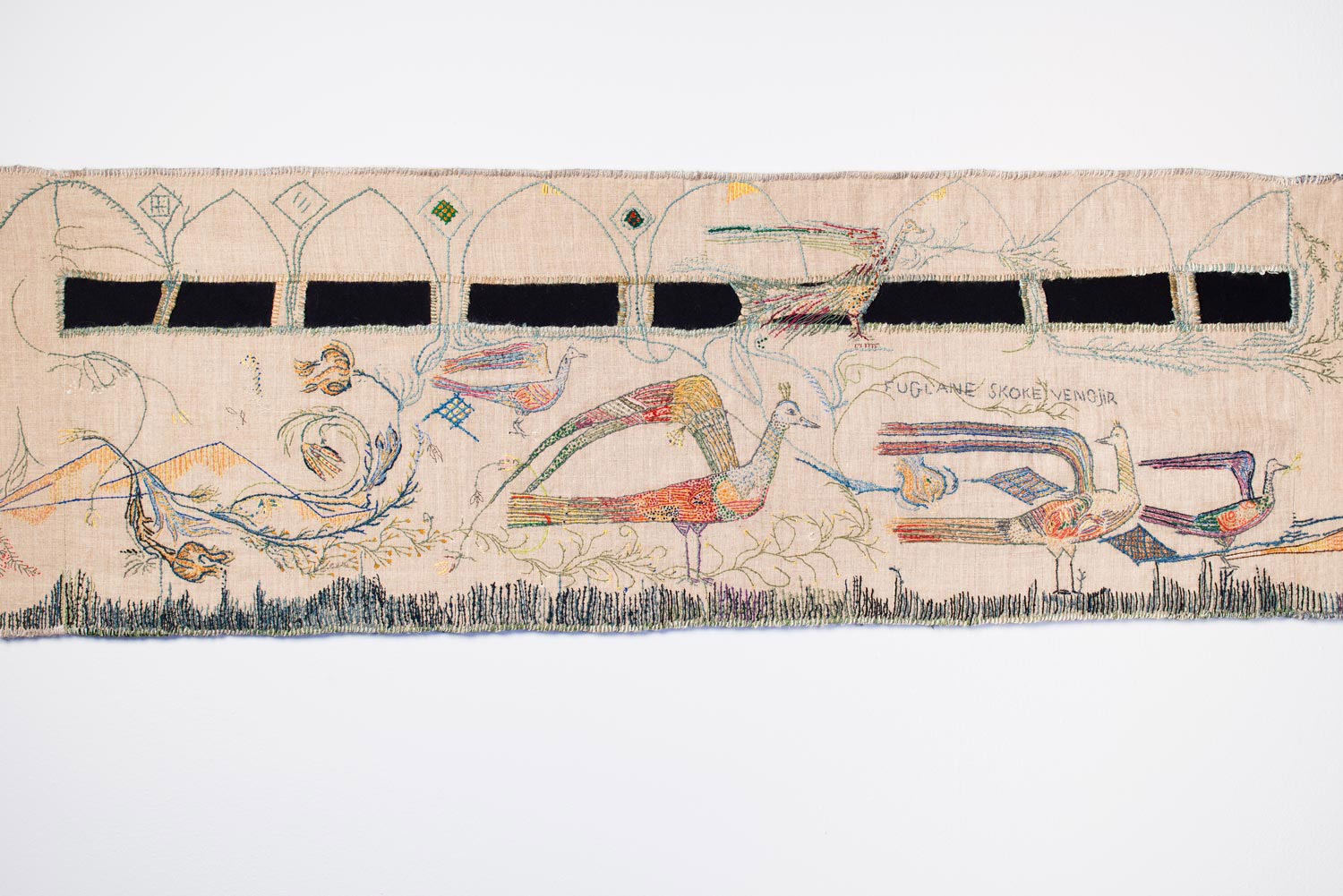 Torvald Moseid, Draumkvedet (1980–1993). Håndbroderi på lin, ca. 54 m (detalj). Foto: Alf-Georg Dannevig. Gjengitt med tillatelse fra SKMU Sørlandets Kunstmuseum.